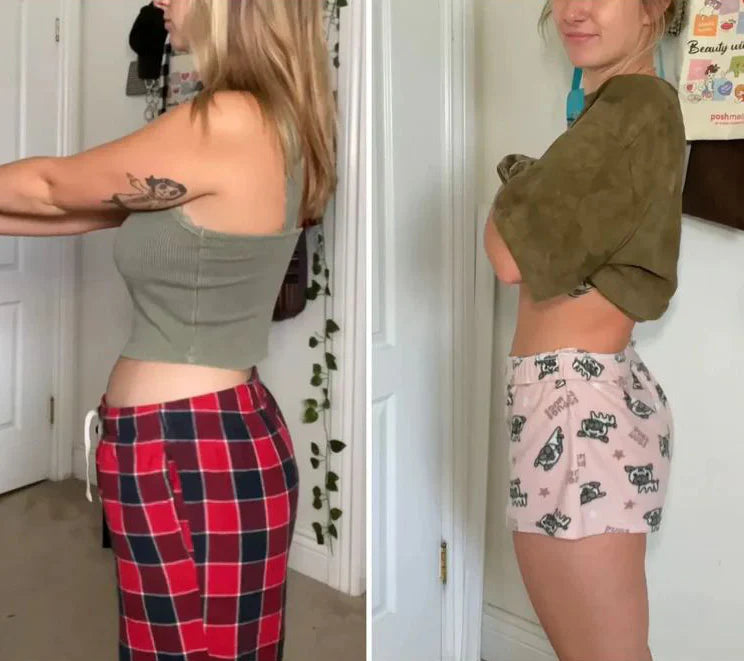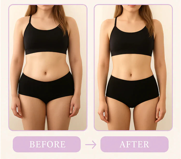 The abdomen appears less toned, with abdominal bloating, water retention, and a heavy feeling in the stomach. The lower abdomen is tense due to period - related discomfort or digestive issues like constipation and gas, resulting in a poor physical state and a lack of lightness.