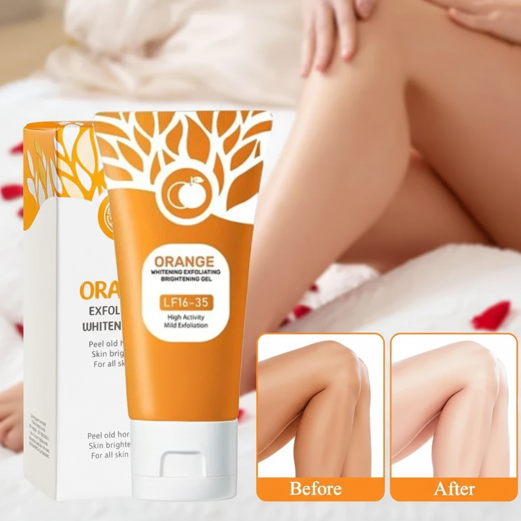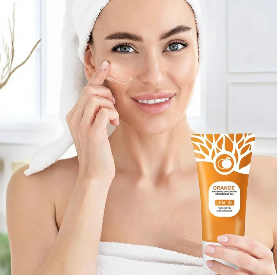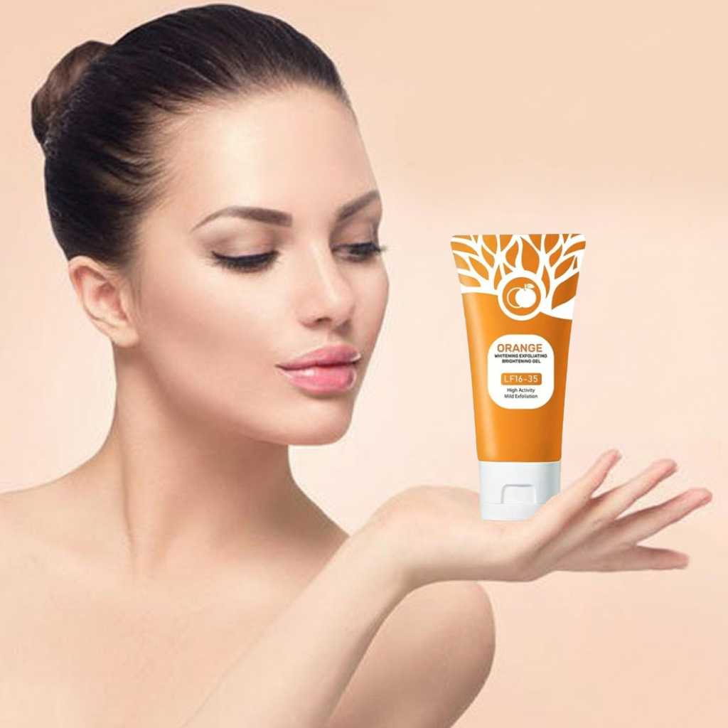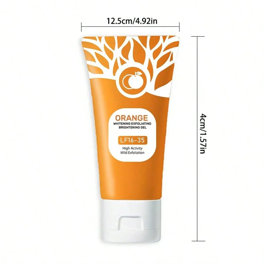 Orange exfoliating gel scrub can be used on multiple parts of the body and face to help remove aging cuticles and make the skin smoother and softer.